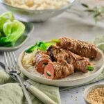 These vegetable-stuffed, marinated veal rolls can be served as a main course accompanied by cooked rice and a vegetable side dish. They also make a great little appetizer. Serve them as elegant finger food or as a plated starter for a party. For a little kick, add a zip of sriracha when serving.