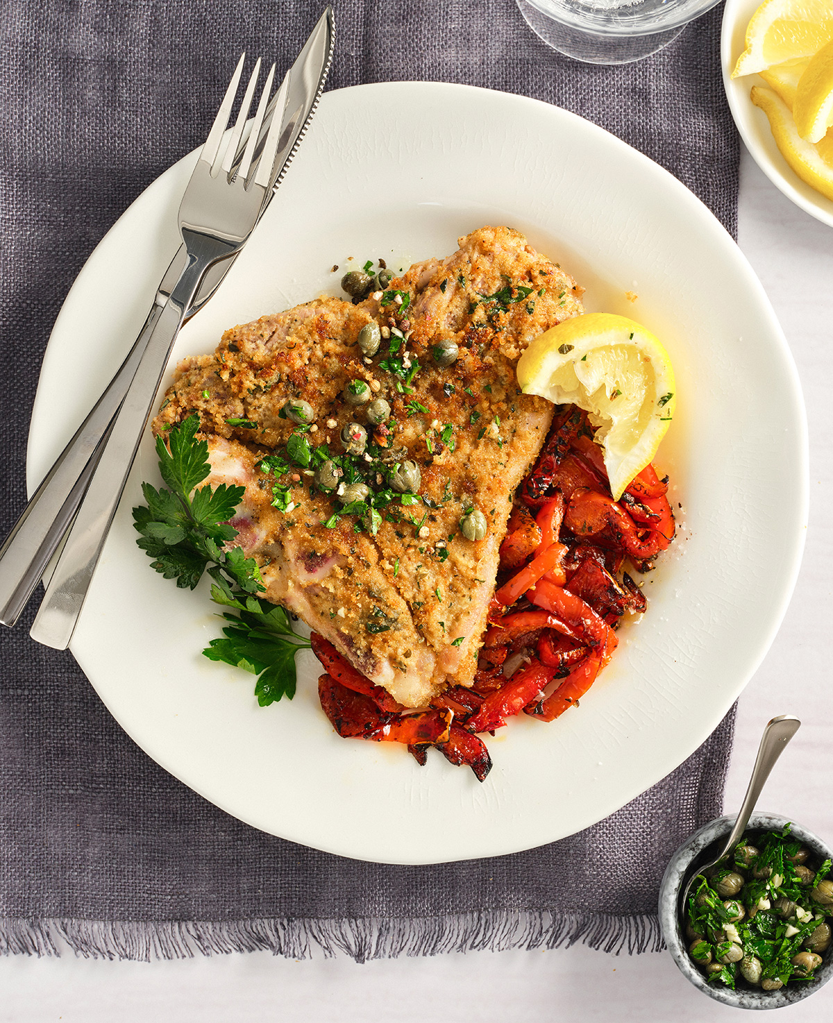 3. Crumb Crust: Meanwhile, combine bread crumbs, Parmesan, capers, parsley, garlic and oregano in another shallow dish. Stir in 2 tbsp (30 mL) of the olive oil. Set aside.